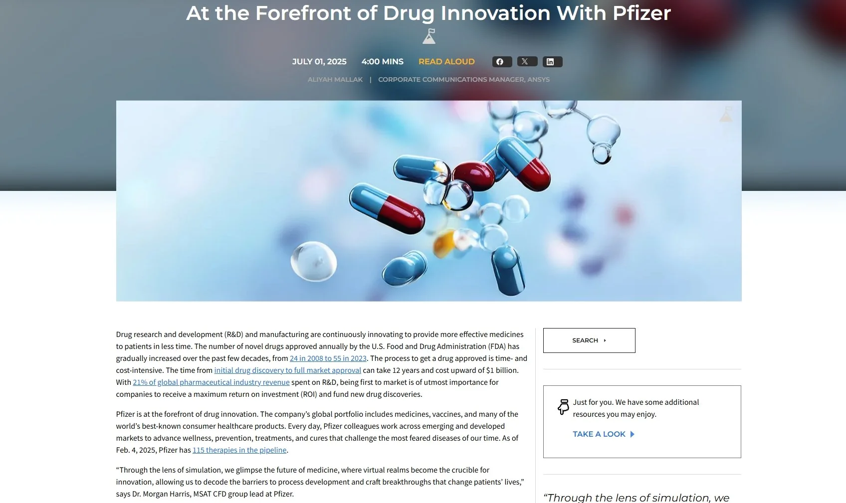 βAt Pfizer, we envision a future where simulations are our guiding stars, illuminating the path to groundbreaking therapies, accelerating drug discovery, and revolutionizing patient care through precise, data-driven insights that transform possibilities into realities,β says Dr. Morgan Harris, MSAT CFD group lead at Pfizer. To read the full article, visit ansys.com